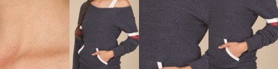 - Raw-edge, off-the-shoulder neckline and raglan sleeves