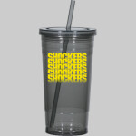 24 oz. double wall acrylic tumbler. Comes with a matching 10 1/4" straw. Stain resistant. Ability to contain hot liquids up to 150 degrees Fahrenheit. Double wall construction for insulation of cold liquids. Approximate size is 7 1/4". Meets FDA requirements. Screw on lid. Hand wash only.