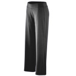 90% polyester/10% spandex knit * Wicks moisture away from the body * Ladies' fit * Heat sealed label * Low rise * Slim fit through thigh opens up to a moderate flair starting at the knee * Double-needle coverstitched waistband with covered elastic * Double-needle hemmed bottom * Machine-washable *