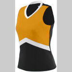 * Wicks moisture away from the body * Girls fit * Heat sealed label * Contrast color V-neck * Double-needle coverstitched armholes and hem * Racerback styling * Contrast color upper front panel * Contrast color middle insert on center front panel.