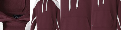 9 oz./yd²., 60/40 cotton/polyester athletic fleece Contrast color inserts Hood with drawcord on Adult sizes only Raglan sleeves Front pouch pocket Rib-knit cuffs and bottom band Woven label
