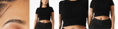 Stretch fit Crewneck binding Set-in cap sleeve 1x1 micro rib Side seamed Mid-length Tear-away label 5.4-ounce, 52/48 Airlume combed and ring spun cotton/polyester, 32 singles Athletic Heather: 90/10 Airlume combed and ring spun cotton/polyester